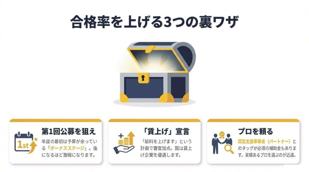 新しい年度の最初の募集(第1回)は、予算が余っているため採択されやすいという「ボーナスステージ」の法則があります。後になるほど激戦になるので、早めの準備が鍵です。 - 「賃上げ」を宣言する