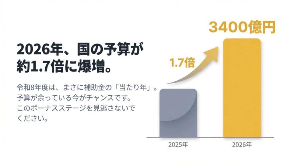 実は2026年(令和8年度)は、国の補助金予算が例年の約1.7倍(約3400億円)に爆増している「当たり年」なんです。しかも、今回の主役は大手企業ではなく、フリーランスや個人事業主などの「小規模事業者」。