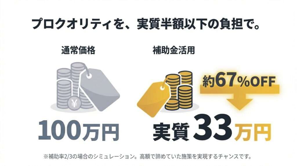 このように、本来なら高額で諦めていたプロクオリティのWeb施策が、実質半額以下の負担で実現できるのが補助金の最大の魅力です。