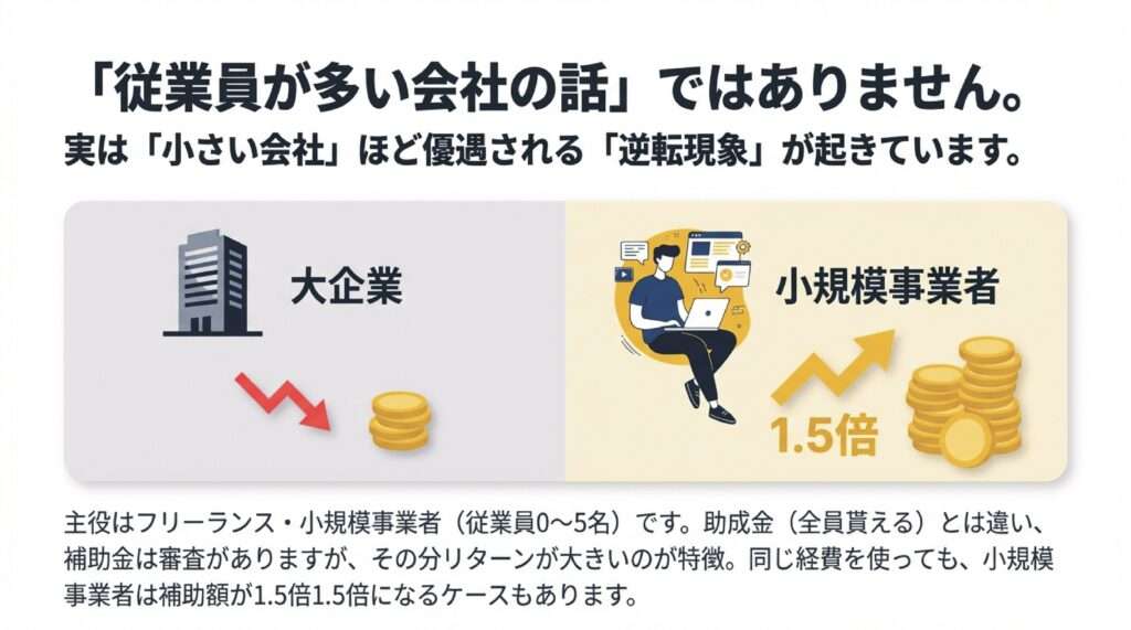 「審査がある」と聞くと難しく感じるかもしれませんが、国は今、小規模事業者を全力で応援しています。そのため、同じ経費を使っても、小さい会社の方が補助金額が1.5倍に増えるといった「逆転現象(優遇措置)」が起きているのです。