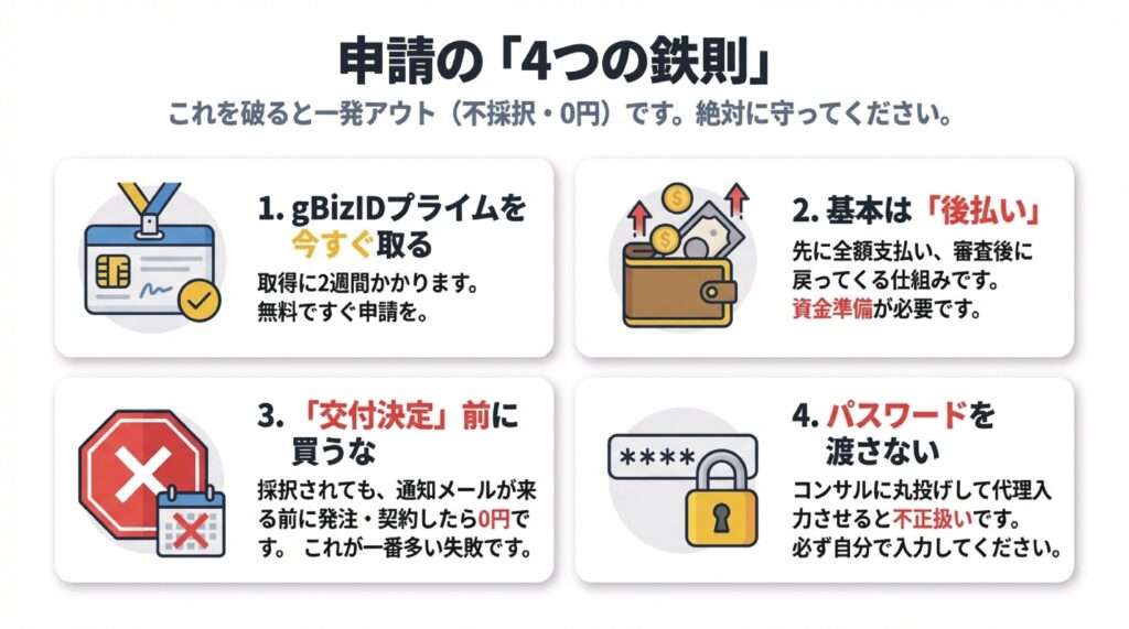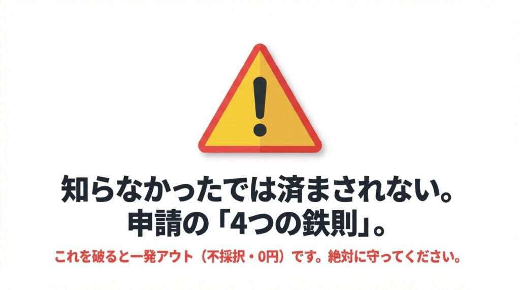 補助金は「知らなかった」では済まされない厳しいルールがあります。これだけは絶対に守ってください。