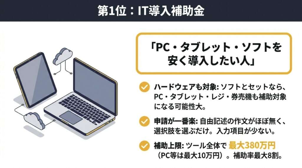 🥇 第1位:IT導入補助金(デジタル化基盤導入枠など)
