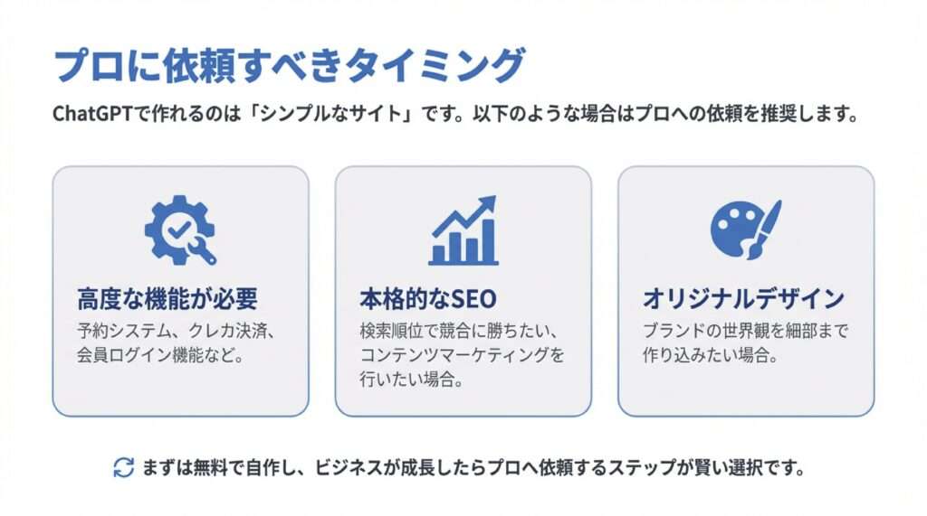 より高度な機能が必要になったら、プロに依頼して本格的なサイトへ発展させましょう。