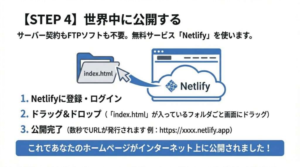 初心者には「Netlify」がおすすめです。ドラッグ&ドロップだけで公開できます。