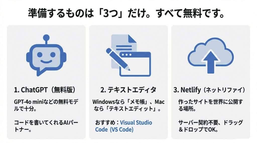 ホームページ作成に必要なものは、以下の3つだけです。すべて無料で利用できます。