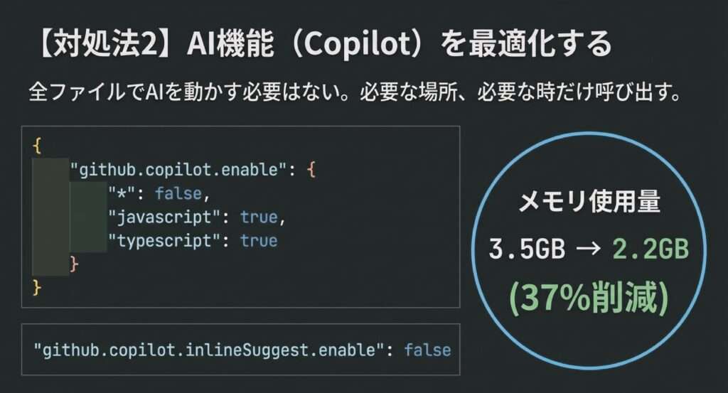 GitHub CopilotやCursorなどのAI機能は便利ですが、常時動作するとメモリを大量に消費します。