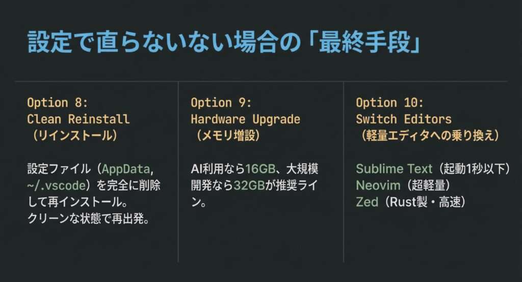 どうしても重い場合、軽量エディタへの乗り換えも選択肢です。