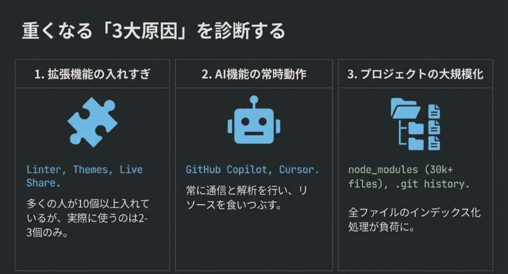 VSCodeが重くなる主な原因3つ