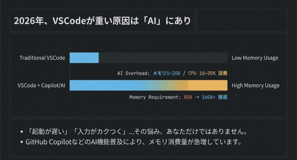 2026年現在、AI機能(GitHub Copilot)の普及により、VSCodeが重いと感じる人が急増しています。